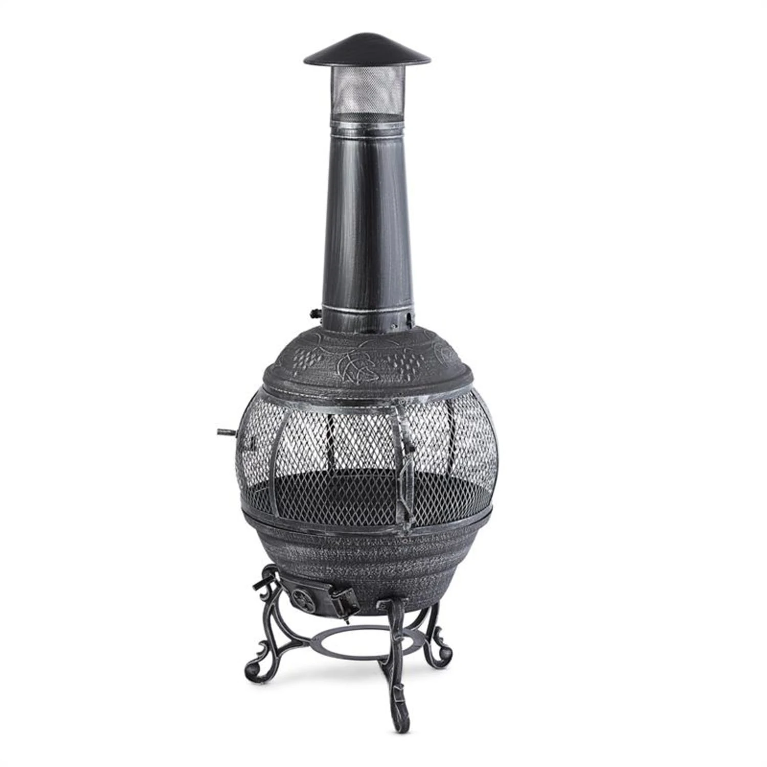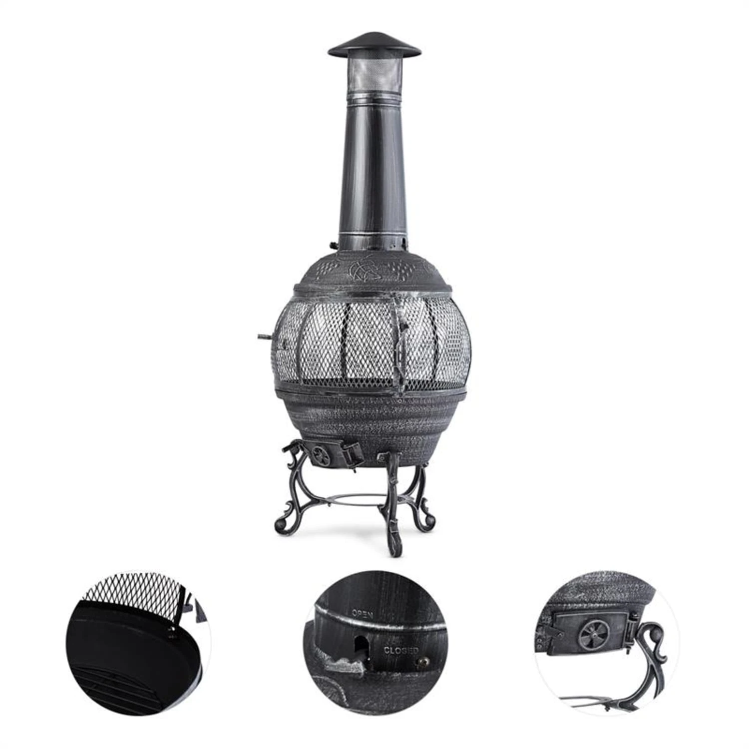 Mit dem Blumfeldt Flavius Gartenofen wird richtig eingeheizt: Der stabile Ofen ist aus bruchfestem Gusseisen und stabilem Stahl gefertigt und verströmt in Minutenschnelle wohlige Wärme. Einfach Kohle, Holz oder Holzkohle im Inneren entzünden und über Stunden Wärme genießen. Eine praktische Zugluftklappe am Boden lässt das Feuer schnell auflodern. Das 360° Rundum-Gitter verhindert Funkenflug und ermöglicht gleichzeitig einen faszinierenden Blick ins Feuer von allen Seiten. Dank der 90 cm hohen Esse steigt Rauch schnell auf und zieht gut ab, während die Hitze des Ofens geschickt verteilt und an die Umgebung abgegeben wird. Mit seinem schicken Äußeren im antiken Design eines Römerofens heizt der Blumfeldt Flavius Terrassenofen nicht nur kräftig ein, er verleiht den Stunden im Freien auch eine einzigartige Atmosphäre. Dekorative Verzierungen sowie eine Oberfläche in einem glänzenden Silberton unterstreichen gekonnt das Ambiente.