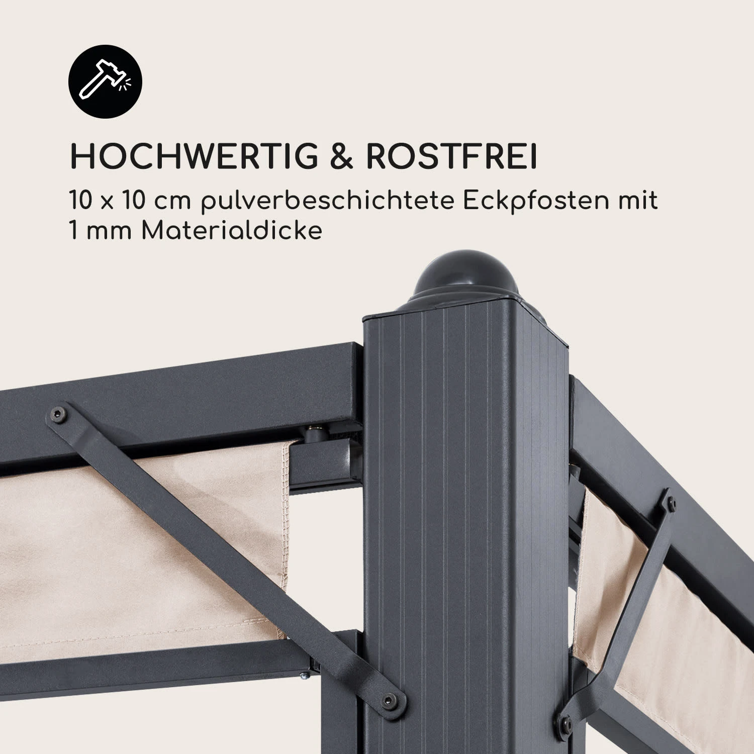 Mit dem stufenlos raffbaren Stoffdach aus 180 g/m² Polyester erhält man die volle Kontrolle über Schatten und Sonne. Der Seilzug lässt das Sonnendach des Pavillons in seinen Führungsschienen geschmeidig vor- und zurückgleiten, die wasserabweisende Beschichtung schützt vor Schimmel und kurzen Regenschauern. Durch die flexibel auf- und abrollbaren Seitenteile aus 160 g/m² Polyester-Stoff bleibt man die ganze Zeit windgeschützt.