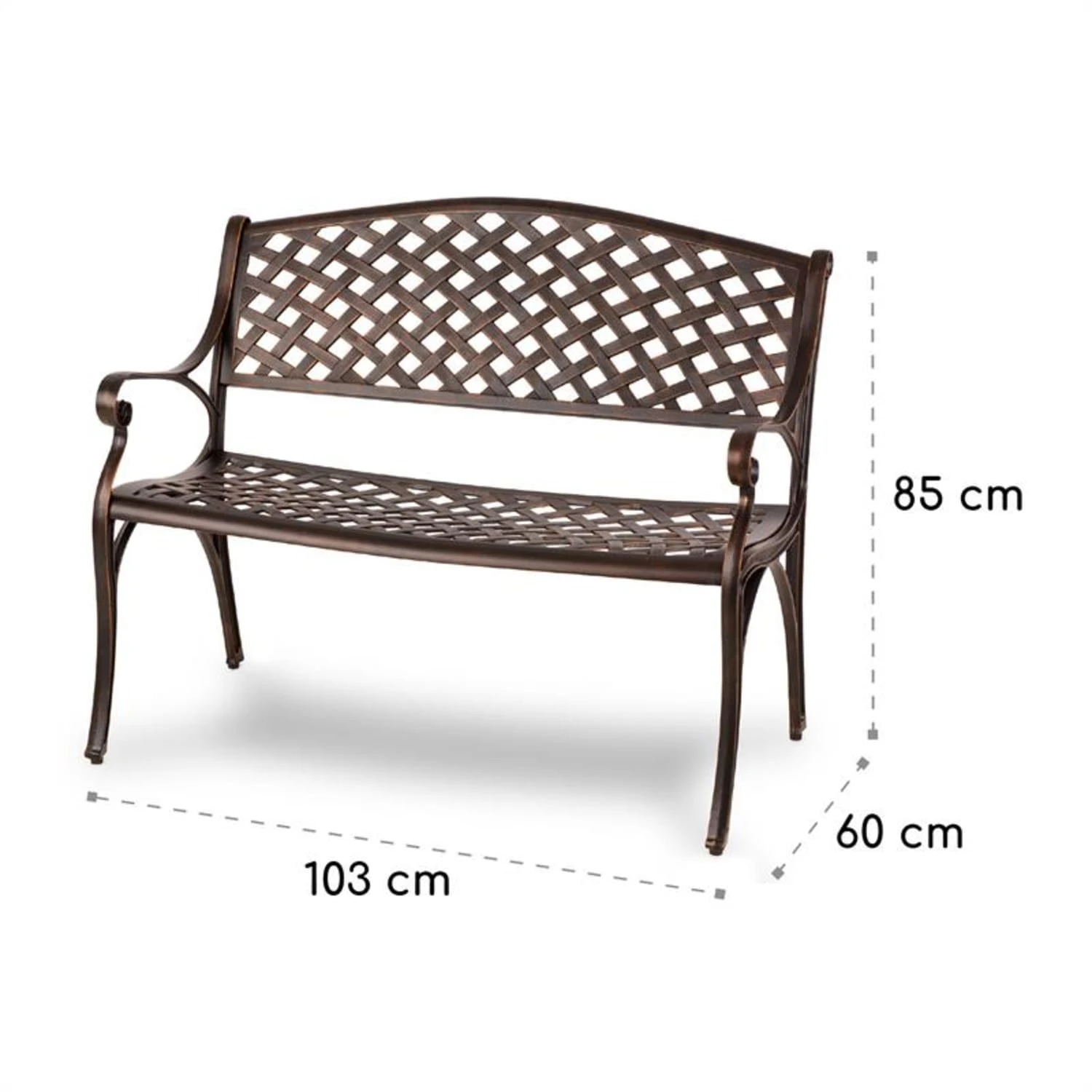 Mit ihrer schmiedeeiserenen Optik besitzt die Gartenbank den Charme längst vergangener Zeiten und bezaubert durch ihre filigrane Eleganz. Komplett aus Aluminiumguss gefertigt hält sie allen Witterungsbedingungen stand und lässt sich aufgrund der glatten Oberflächen wunderbar einfach reinigen. Mit ihrer knapp einen Meter breiten Sitzfläche bietet sie genug Platz für zwei Personen, die es sich zum Entspannen besonders bequem machen können. Wer es noch komfortabler haben möchte, kann eines der optional erhältlichen und passgenauen Sitzkissen verwenden.