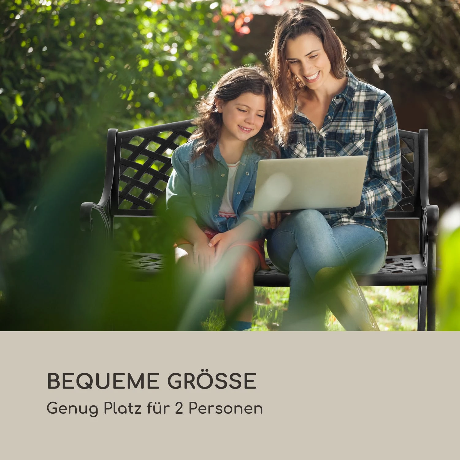 Mit ihrer schmiedeeiserenen Optik besitzt die Gartenbank den Charme längst vergangener Zeiten und bezaubert durch ihre filigrane Eleganz. Komplett aus Aluminiumguss gefertigt hält sie allen Witterungsbedingungen stand und lässt sich aufgrund der glatten Oberflächen wunderbar einfach reinigen. Mit ihrer knapp einen Meter breiten Sitzfläche bietet sie genug Platz für zwei Personen, die es sich zum Entspannen besonders bequem machen können. Wer es noch komfortabler haben möchte, kann eines der optional erhältlichen und passgenauen Sitzkissen verwenden.